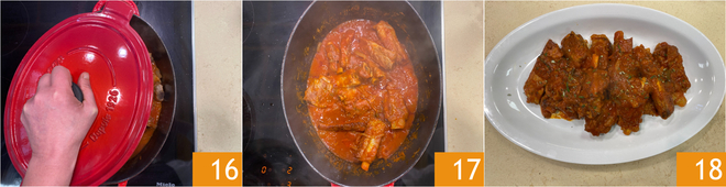 Couvrez avec un couvercle 16 et faites cuire à feu doux pendant environ 2 heures, en remuant de temps en temps 17. À la fin de la cuisson, la viande doit être si tendre qu'elle se défait et la sauce bien épaisse. Votre sauce avec des côtelettes est prête à être dégustée comme vous le souhaitez 18 !