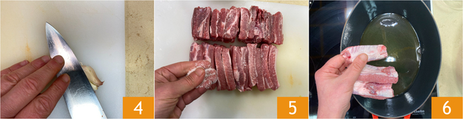 Écrasez une gousse d'ail 4, puis occupez-vous des côtelettes : saupoudrez-les de sel 5 et massez pour assaisonner la viande uniformément. Dans une grande casserole, chauffez l'huile à feu vif et ajoutez les côtelettes 6.