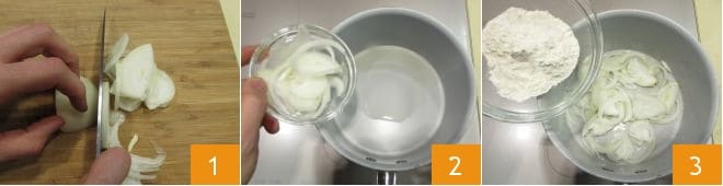 Pour réaliser la sauce enchilada, épluchez l'oignon blanc et tranchez-le 1, dans une casserole, chauffez les 15 g d'huile de graines et ajoutez ensuite les tranches d'oignon blanc 2, versez également la farine tamisée 3,