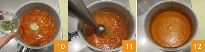 diluez avec l'eau 7, pour plus de commodité vous pouvez utiliser le même pichet utilisé pour les tomates pelées. Aromatisez avec l'ail écrasé, en vous aidant d'un presse-ail 8 et ajoutez également le sucre de canne 9