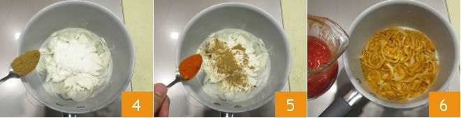 le cumin 4 et le piment en poudre 5, faites revenir pendant 3-4 minutes puis versez les tomates pelées 6