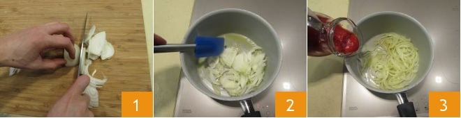 Pour préparer la sauce ketchup, épluchez les oignons et émincez-les finement 1. Versez l'huile dans une casserole, ajoutez les oignons et laissez-les fondre pendant 4-5 minutes en remuant de temps en temps 2. À ce stade, ajoutez également la purée de tomates 3