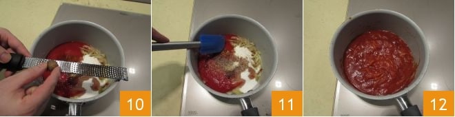 Enfin, parfumez avec la noix de muscade fraîchement râpée 10 et mélangez le tout 11. Laissez cuire pendant 1 heure et vingt minutes 12 à feu doux en remuant de temps en temps pour éviter que le mélange ne colle au fond.