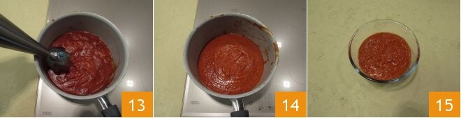À ce stade, mixez le mélange 13, afin d'obtenir une consistance lisse et homogène 14. Votre sauce ketchup est prête à être dégustée !