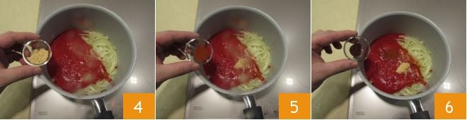 le gingembre en poudre 4, le paprika 5 et les clous de girofle finement hachés 6.