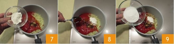 Ajoutez ensuite la farine 7, le vinaigre de vin rouge 8, le sucre 9 et le sel.