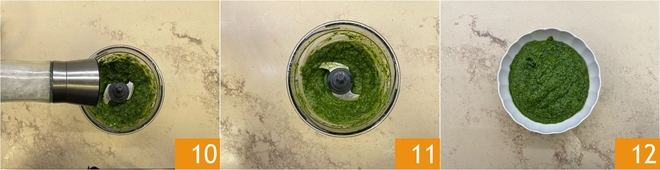 Goûtez la sauce obtenue, ajustez le sel 10 et mixez une dernière fois jusqu'à obtenir la consistance désirée 11. Votre sauce verte sans œufs est prête à être servie 12 !