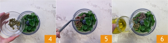 Ajoutez les câpres dessalées 4, les anchois à l'huile 5 et l'huile 6.