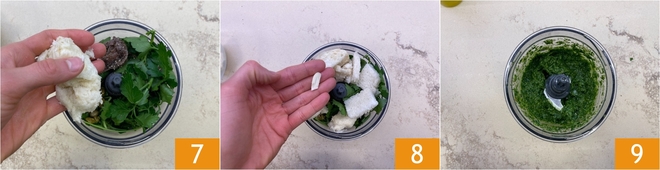 Enfin, ajoutez le pain essoré 7 et la gousse d'ail 8 et mixez pendant quelques secondes 9.