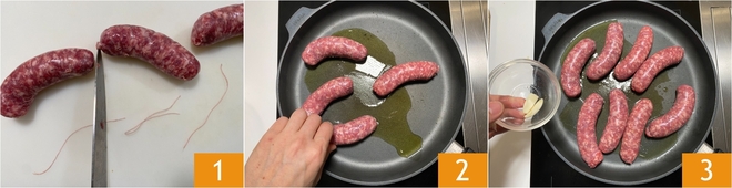 Pour préparer la saucisse à la poêle, commencez par enlever le fil qui les unit 1 et conservez le boyau, ainsi elles garderont leur forme. Chauffez un filet d'huile dans une large poêle antiadhésive, puis déposez les saucisses 2 et ajoutez les gousses d'ail 3.