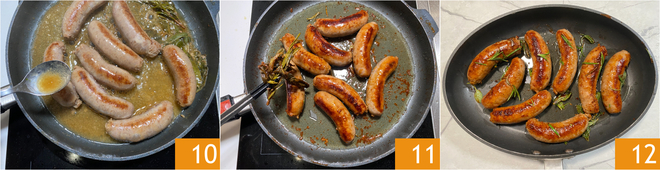 Pendant la cuisson, remuez de temps en temps pour obtenir une couleur homogène 10. Une fois prêtes, retirez les herbes aromatiques 11. Servez immédiatement la saucisse à la poêle en la garnissant de quelques brins de romarin et de quelques feuilles de sauge 12 !