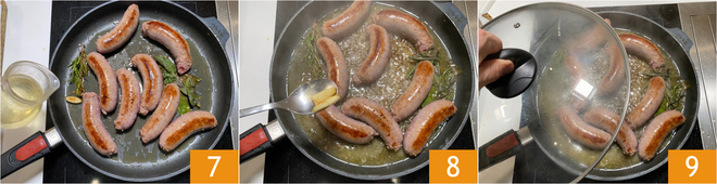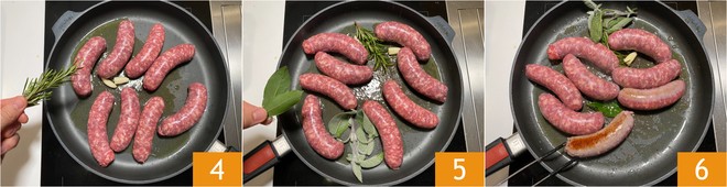 Parfumez avec le romarin 4, la sauge et le laurier 5. Faites revenir les saucisses à feu moyen-vif jusqu'à ce qu'elles soient dorées, puis retournez-les 6 ; comptez environ 6 minutes au total.