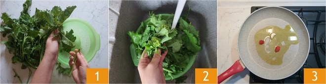 Pour préparer saucisse et friarielli, commencez par nettoyer ces derniers : mettez de côté les tiges avec les plus petites feuilles et les inflorescences, assurez-vous qu'il n'y a pas de parties jaunies sur les plus grandes feuilles, elles devront être éliminées. Enlevez des tiges les feuilles saines en tenant d'une main la tige et en tirant vers le haut la partie avec les feuilles 1. Lavez bien les friarielli sous l'eau courante 2. Dans une poêle, mettez de l'huile, l'ail et le piment coupé en deux 3,