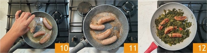 et versez le vin blanc 10. Laissez évaporer et sécher le vin, puis terminez la cuisson des saucisses dans la poêle jusqu'à ce qu'elles soient dorées : si vous le souhaitez, vous pouvez ajouter un filet d'huile 11. Une fois que les saucisses sont bien dorées, transférez-les dans la poêle avec les friarielli. Remettez la poêle sur le feu et faites infuser pendant cinq minutes. Servez saucisse et friarielli en dégustant le tout bien chaud 12.