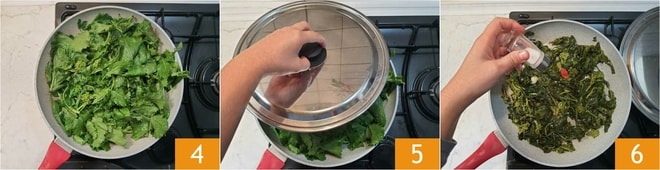 chauffez le tout et ajoutez également les friarielli 4. Couvrez avec un couvercle et faites cuire les friarielli jusqu'à ce qu'ils soient bien fanés 5. Remuez souvent avec une cuillère en bois et ajoutez le sel à mi-cuisson. Retirez-les du feu lorsqu'ils seront bien tendres et fanés 6.