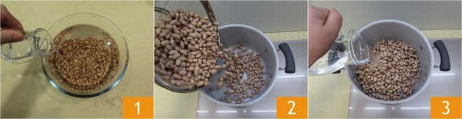 Pour préparer la saucisse et les haricots, commencez par faire tremper les haricots borlotti pendant 8 heures 1. Le lendemain, égouttez les haricots, rincez-les puis versez-les dans une grande casserole 2, couvrez-les d'eau froide 3 et portez à ébullition. Dès que l'eau atteint la température, baissez le feu pour faire mijoter le tout et faites cuire environ 50 minutes; salez seulement en fin de cuisson.