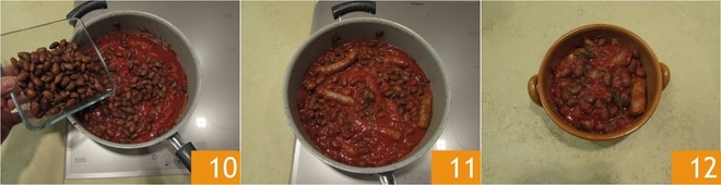 Ajoutez-les à la sauce en continuant la cuisson pendant encore 10-15 minutes 10, en laissant bien mélanger les saveurs 11. À ce stade, votre plat de saucisse et haricots est prêt, ajoutez du romarin haché, un filet d'huile crue et servez 12 !