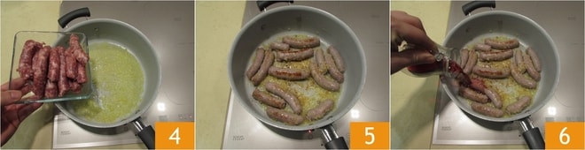 En attendant, pelez un oignon et hachez-le au couteau, puis versez-le dans une poêle avec de l'huile et faites cuire à feu doux pendant 6-7 minutes. Ajoutez ensuite les saucisses 4 et laissez-les dorer pendant 3-4 minutes, en remuant de temps en temps pour éviter que le fond ne brûle 5. Déglacez avec le vin 6, jusqu'à ce que l'alcool soit complètement évaporé.