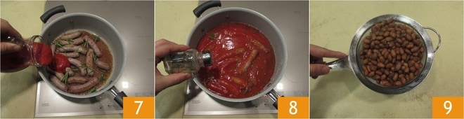 Ajoutez les brins de romarin et la purée de tomates 7. Assaisonnez de sel et de poivre 8 et laissez cuire pendant 35-40 minutes à feu doux. Une fois le temps écoulé, égouttez les haricots cuits 9.
