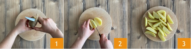 Pour préparer saucisse et pommes de terre à la poêle, commencez par les tubercules, rincez-les, séchez-les et épluchez-les 1. Ensuite, coupez-les en quartiers 2 dans le sens de la longueur 3.