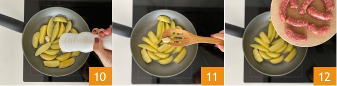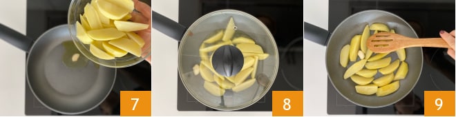 Faites dorer l'ail dans une poêle avec un peu d'huile, puis ajoutez les pommes de terre 7, couvrez avec le couvercle et faites cuire à feu vif pendant 5 minutes 8 ; grâce à la vapeur, elles ramolliront, veillez à remuer de temps en temps 9.