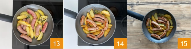 Parfumez avec le romarin légèrement effeuillé 13. En environ 20 minutes, le tout sera prêt, alors faites cuire à température moyenne et remuez délicatement de temps en temps ; ajustez le sel à votre convenance 14. Servez très chaud le plat de saucisse et pommes de terre à la poêle 15.