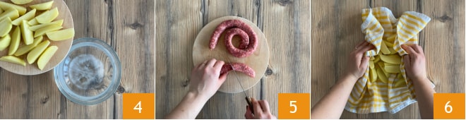 Placez les quartiers de pommes de terre dans un bol avec de l'eau dans laquelle vous avez dissous le bicarbonate de soude 4 ; laissez tremper pendant 15 minutes. Pendant ce temps, coupez la saucisse en morceaux de 6-7 cm chacun 5 et mettez-les de côté. Une fois le temps écoulé, égouttez et séchez bien les pommes de terre 6.