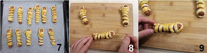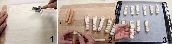 Pour préparer les saucisses momies, commencez par prendre un rouleau de pâte feuilletée prête à l'emploi (ou vous pouvez la préparer vous-même, en suivant la recette que vous trouverez en cliquant ici); coupez 12 bandes d'environ 1 cm de large à l'aide d'une roulette à pâtisserie 1. Enveloppez chaque saucisse avec une bande de pâte feuilletée, en l'enroulant autour en mouvement spiralé (laissez découverte la dernière partie de la saucisse, qui servira de visage à la momie) 2. Lorsque toutes les saucisses seront "bandées", disposez-les sur une plaque recouverte de papier sulfurisé 3.
