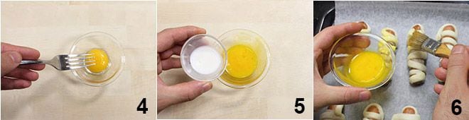 À part, battez le jaune d'œuf dans un petit bol avec une fourchette 4, ajoutez le lait 5 et badigeonnez le mélange obtenu sur chaque momie 6.