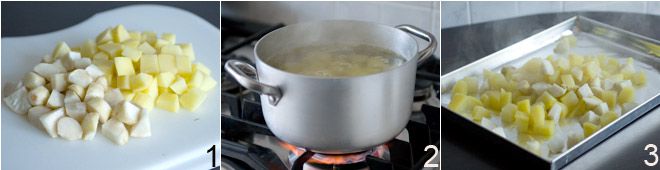 Pelez, lavez et coupez en petits morceaux de 2 cm de côté les pommes de terre et les topinambours 1. Dans une grande casserole, faites bouillir de l’eau avec du sel; quand elle arrive à ébullition, incorporez les topinambours et faites-les cuire pendant 5 minutes. Après les 5 minutes, ajoutez les pommes de terre et faites cuire le tout pendant encore 5 minutes 2. Préchauffez le four à 180º. Égouttez les pommes de terre et les topinambours. Tapissez un plat de cuisson de papier sulfurisé, versez les pommes de terre et les topinambours 3 et ajoutez un bon filet d'huile d'olive. Enfournez pendant 60 minutes en secouant de temps en temps le plat pour éviter qu'ils n'attachent au fond.