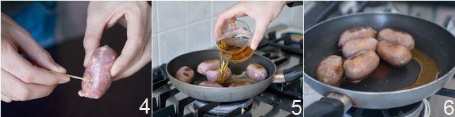 Après ce temps, saupoudrez les tubercules de gros sel et ajoutez les aiguilles de romarin lavées. Augmentez la température du four à 200º et faites dorer les tubercules. Pendant ce temps, préparez les verzini : piquez-les avec un cure-dent 4, faites-les revenir dans une poêle avec un filet d'huile d'olive jusqu'à ce qu'ils soient dorés de chaque côté. Ensuite, incorporez la bière 5 et faites cuire à feu doux jusqu'à ce que la bière soit absorbée et commence à caraméliser. À ce stade (attention, cela brûle très facilement), ajoutez 100 ml d'eau chaude et secouez la poêle pour créer un peu de sauce, très savoureuse 6. Servez les verzini chauds avec leur sauce, accompagnés des pommes de terre et topinambours rôtis.