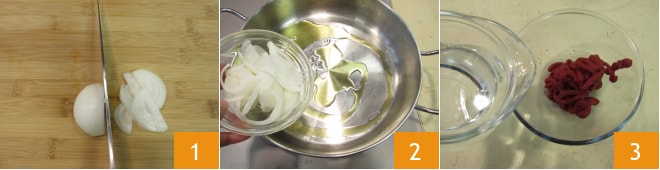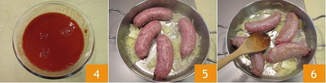 Pour préparer les saucisses à la sauce, commencez par les oignons. Après les avoir épluchés, émincez-les finement 1. Versez les tranches fines dans une poêle avec un filet d'huile et laissez dorer à feu doux pendant quelques minutes 2. Pendant ce temps, versez l'eau sur le concentré de tomate 3