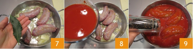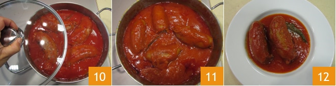 couvrez avec le couvercle et laissez cuire à feu doux pendant environ 25 minutes 10. À la fin, décidez de la consistance de la sauce selon votre goût, il suffira de prolonger la cuisson de quelques minutes, de préférence sans couvercle, si vous voulez un assaisonnement plus épais 11. Voici vos saucisses à la sauce prêtes, bon appétit 12.