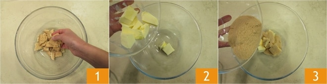 Pour préparer le saucisson au cacao, commencez par émietter les biscuits secs 1 et gardez-les de côté. Versez dans un grand bol le beurre mou 2 et le sucre de canne 3.