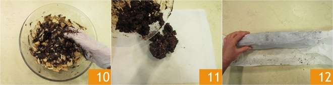 Mélangez les ingrédients pour bien amalgamer le tout 10. Transférez le mélange sur une feuille de papier sulfurisé 11 et, avec les mains, formez le saucisson en roulant le papier 12.