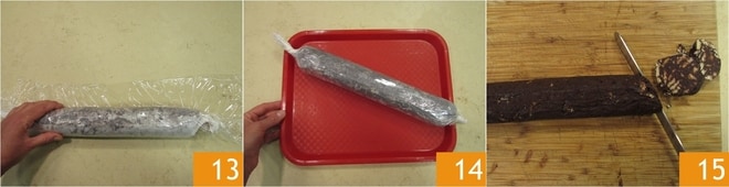 Pressez bien pour compacter et enveloppez le saucisson avec du film alimentaire 13. Laissez reposer au réfrigérateur pendant environ 2 heures. Coupez le saucisson au cacao en tranches et dégustez-le 15 !