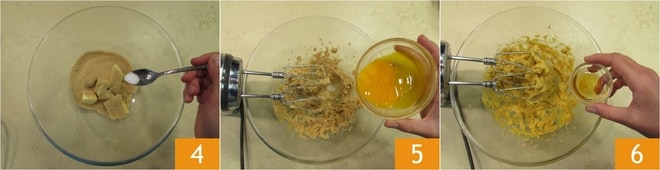 Ajoutez aussi le sel 4 et travaillez les ingrédients avec un batteur électrique jusqu'à obtenir un mélange homogène. Incorporez au mélange les jaunes d'œufs 5 et la liqueur 6.