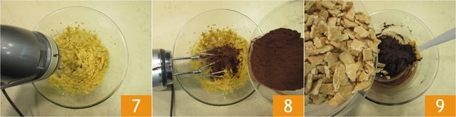 Mélangez à nouveau jusqu'à absorption complète 7. Enfin, versez dans le bol le cacao en poudre tamisé 8 et mélangez avec le batteur électrique pendant quelques secondes. Incorporez les biscuits émiettés dans le bol 9.