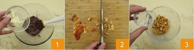Pour préparer le saucisson au chocolat aux fruits exotiques, commencez par faire fondre le chocolat au bain-marie ou au micro-ondes, puis ajoutez le beurre et mélangez jusqu'à ce qu'il soit fondu 1. Mettez de côté pour tiédir et, entre-temps, hachez la mangue, l'ananas et la papaye déshydratés 2. Placez-les dans un bol et arrosez de rhum 3.