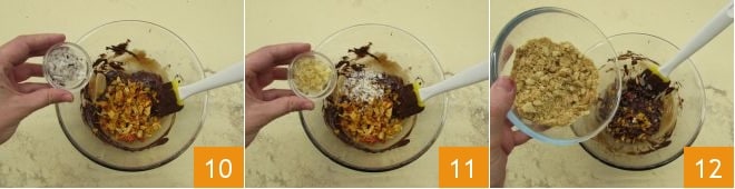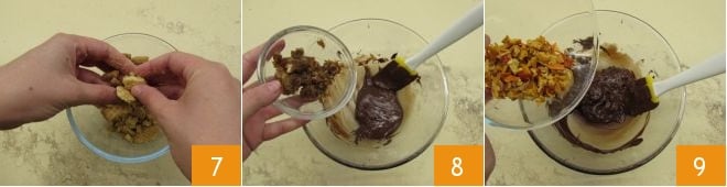 Enfin, émiettez les biscuits dans un récipient 7 et passez à la formation du saucisson au chocolat. Dans le récipient contenant le chocolat fondu et mélangé avec le beurre, ajoutez les dattes 8, le mélange de fruits secs qui aura entre-temps absorbé le rhum 9,