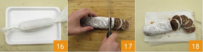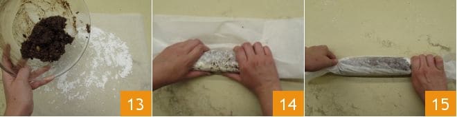 Mélangez bien jusqu'à obtenir un mélange homogène et transférez-le sur une feuille de papier cuisson saupoudrée de sucre glace 13. Modelez bien avec les mains en vous aidant toujours de la feuille de papier cuisson pour obtenir un gros boudin 14. Enfin, enveloppez le saucisson comme un bonbon dans le papier cuisson en roulant et serrant les deux extrémités 15.