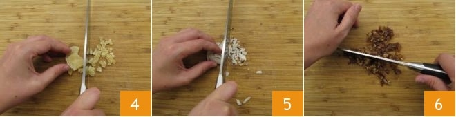 En attendant, hachez également le gingembre confit 4, la noix de coco déshydratée 5 et les dattes dénoyautées 6.