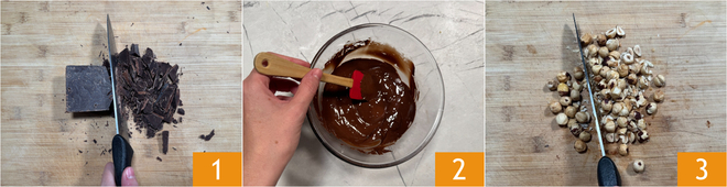 Pour préparer le saucisson au chocolat vegan, commencez par hacher le chocolat noir au couteau 1 et déposez‑le dans un bol. Faites fondre le chocolat au bain‑marie ou au micro‑ondes, par tranches de 30 secondes, en remuant entre chaque passage pour éviter qu'il ne chauffe trop 2. Mettez de côté le chocolat fondu et hachez grossièrement les noisettes 3.