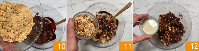 Incorporez également les biscuits émiettés 10, les noisettes hachées 11 et la boisson d'avoine 12, en mélangeant au fur et à mesure.