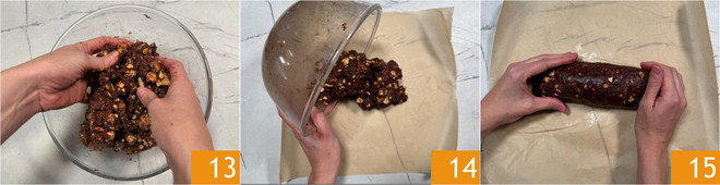 Poursuivez en pétrissant avec les mains jusqu'à obtenir une préparation consistante et homogène 13. Versez la préparation sur une feuille de papier cuisson 14 et façonnez‑la en un cylindre 15.