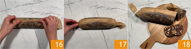 Enroulez le papier cuisson autour du cylindre 16 et torsadez les extrémités pour le sceller 17. Placez au réfrigérateur pendant au moins 2 heures. Une fois le temps de raffermissement écoulé, laissez le saucisson au chocolat vegan revenir à température ambiante environ 20 minutes avant de le déguster 18 !