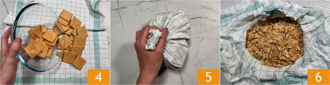 Déposez les biscuits secs sur un torchon propre 4, puis refermez‑le en paquet et frappez‑le sur le plan de travail 5 pour les casser de façon irrégulière et obtenir des miettes grossières de tailles variées 6.
