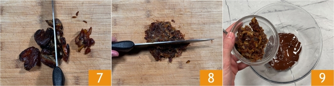 Enfin, dénoyautez et hachez les dattes 7, puis écrasez‑les avec la lame du couteau pour obtenir une pâte 8. Nous recommandons de ne pas les laisser trop grossières. Ajoutez les dattes au chocolat fondu 9 et mélangez avec une maryse.