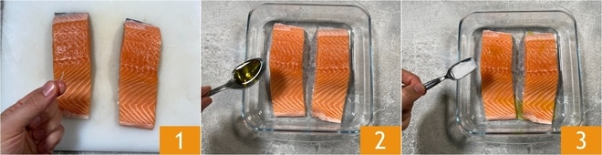 Pour préparer le saumon à la friteuse à air, commencez par le nettoyage. Retirez les arêtes et les éventuelles écailles sur le filet 1. Une fois nettoyés, déposez les filets de saumon dans un plat, assaisonnez-les avec l'huile d'olive extra vierge 2 et le sel 3.