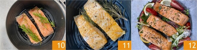 Faites cuire les filets de saumon à 180 degrés pendant 12 minutes sans jamais les retourner 10. Passé ce temps, les filets seront dorés 11, tandis que les herbes aromatiques se seront séchées. Servez votre saumon à la friteuse à air avec des herbes aromatiques fraîches, du zeste de citron, une salade mixte et quelques tomates coupées en quartiers 12.